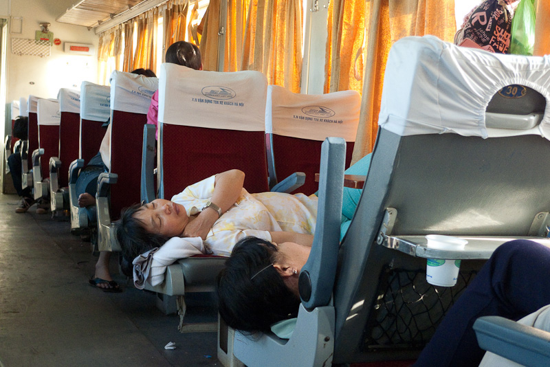Wer vorhat so wie wir eine Strecke mit dem Zug zurück zulegen kann sich seine Tickets meist im Hotel buchen lassen, aber auch direkt vor Fahrantritt am Bahnschalter kaufen – was meist günstiger ist, da sich die Hotels den Service natürlich bezahlen lassen. Wir haben für unsere Zugtickets übers Hotel von Danang – Nha Trang (18$ p.P.) und von Nha Trang – Saigon (16$ p.P.) bezahlt. Vorteil durch das im voraus buchen ist, dass wir genau wussten wann die Züge fahren und waren wir pünktlich zur Fahrt nach Nha Trang am Bahnhof, wo wir es uns im Wartesaal gemütlich machten.